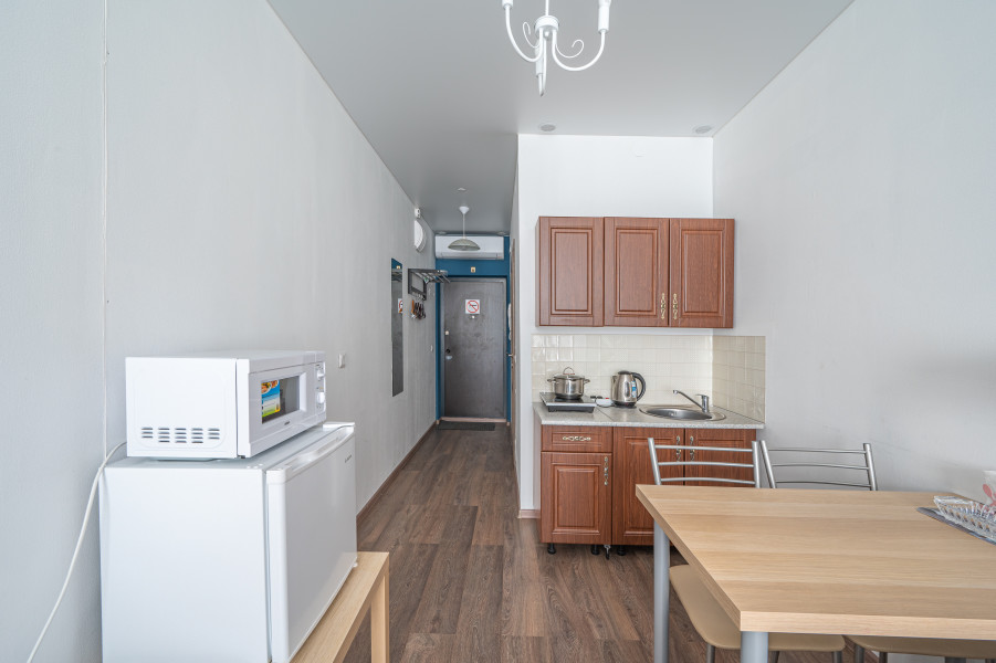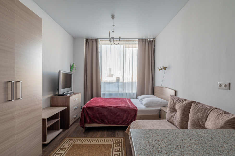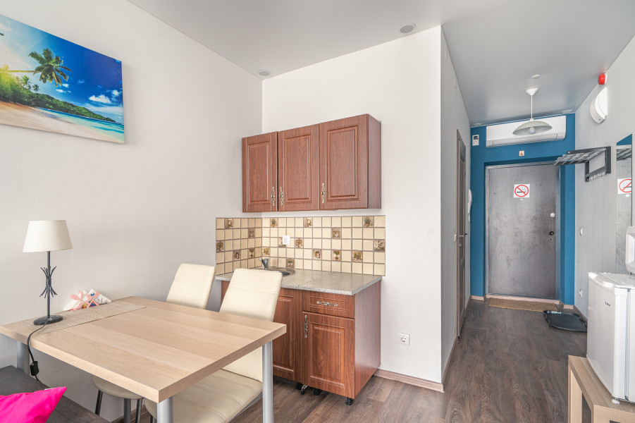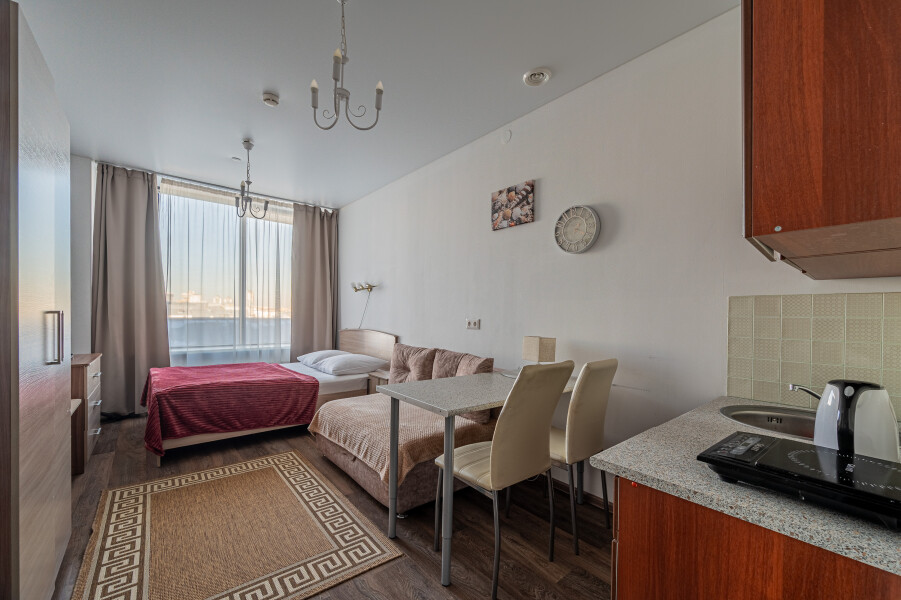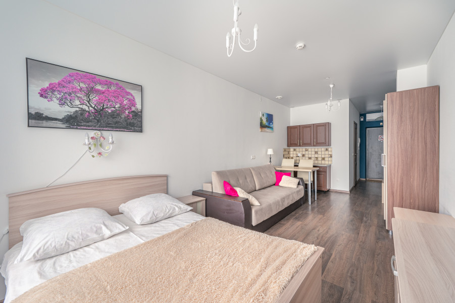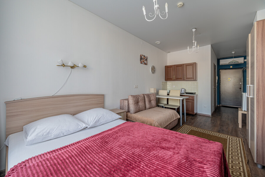 Апартамент 24 м² с двуспальной кроватью и раскладным диваном. Душевая кабина, санузел, мини-кухня: индукционная плита, микроволновка, холодильник, чайник.