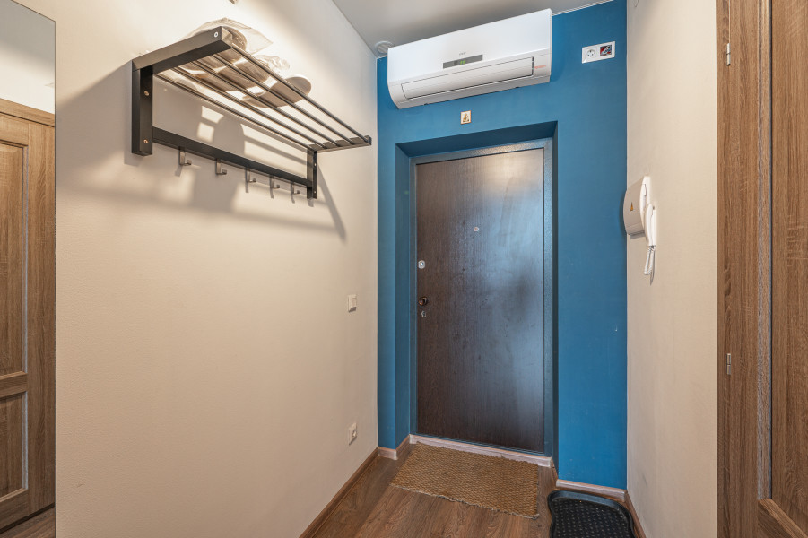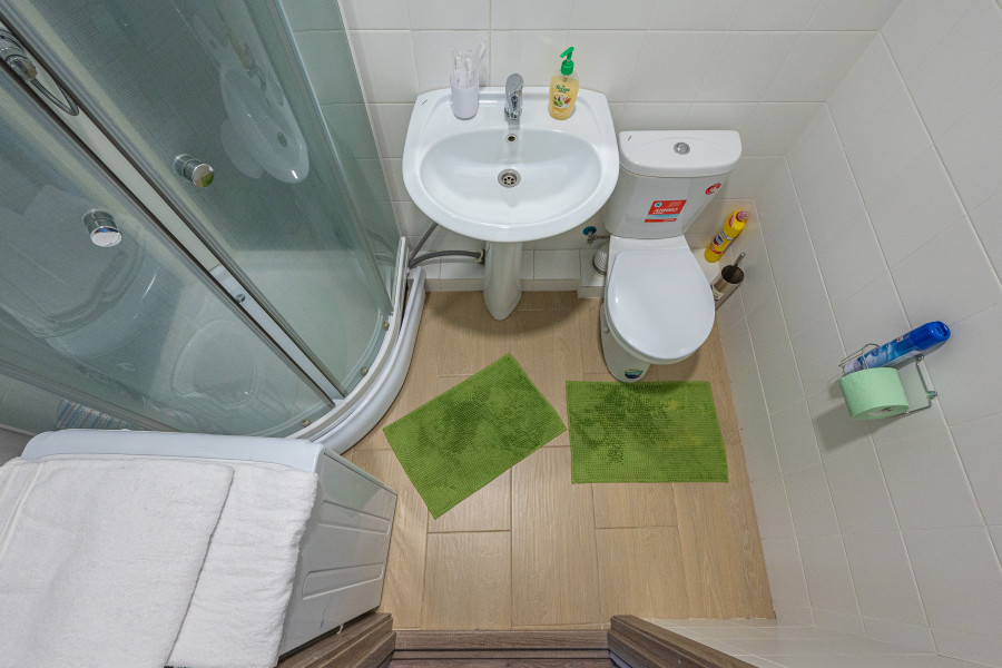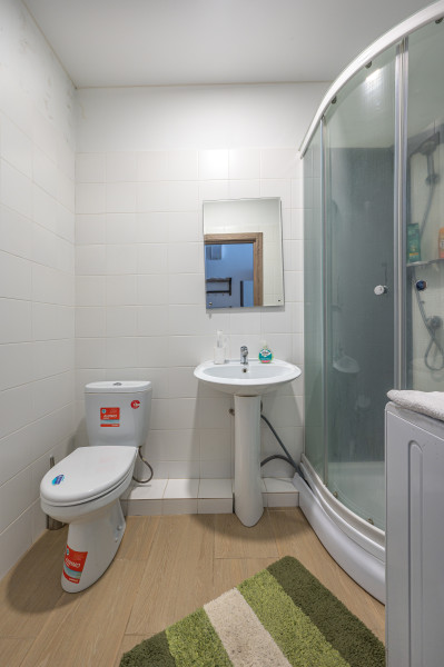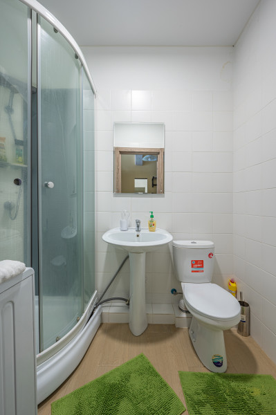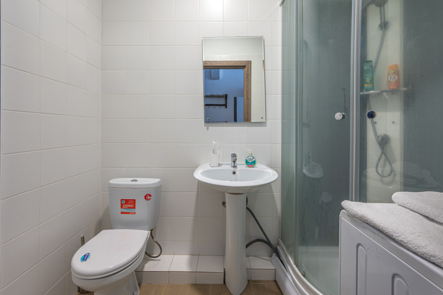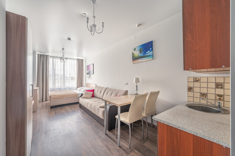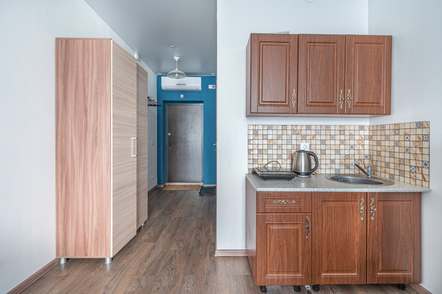 Апартамент 24 м² с двуспальной кроватью и раскладным диваном. Душевая кабина, санузел, мини-кухня: индукционная плита, микроволновка, холодильник, чайник.