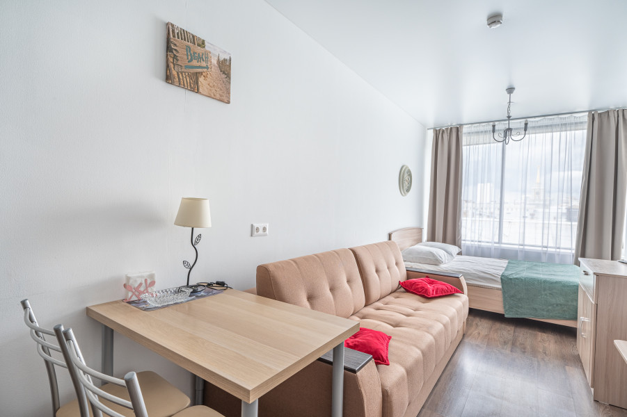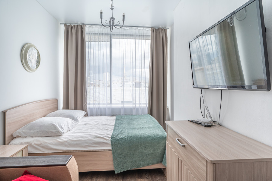 Апартамент 30 м² с двуспальной кроватью и диваном-кроватью. Панорамный вид на шпиль Администрации и Золотоухий собор, душевая кабина, полная кухня.